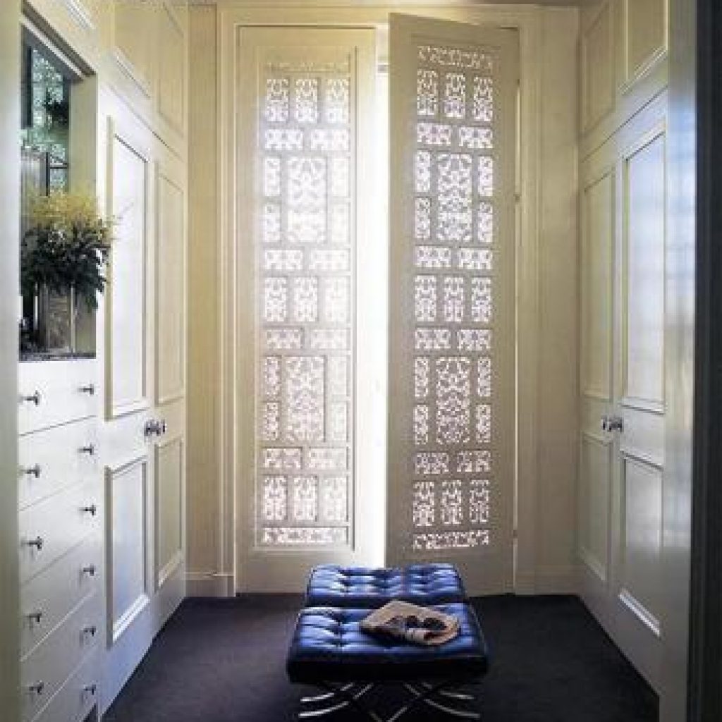 In the master bedroom (which the previous owner had converted from the original dining room), the only way to comfortably fit a king-size bed was to cover the windows—literally. Weisman and Fisher docked them and nearly everything else with yards of lush flannel-like cloth. “It works because we can see through to the dressing room windows,” says Weisman, “but it is a shocking idea. I can’t imagine trying to convince a client to do this. I mean, it’s just so weird!”