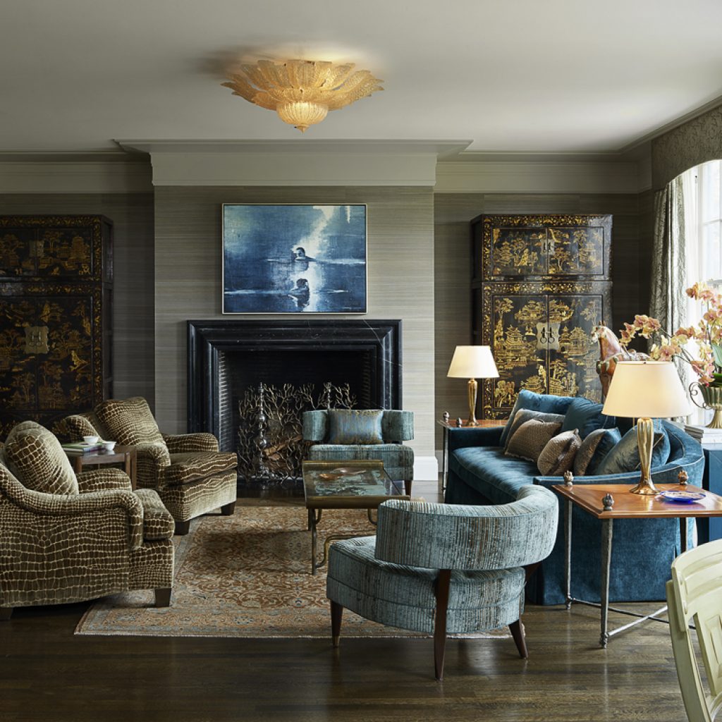 Never ones to completely do away with a client’s existing furnishings for the sake of a clean slate, the designers incorporated many of the family’s treasured pieces, from antique carpets and artworks to a pair of Chinese lacquered armoires. These helped inspire a serene color palette punctuated by fabrics in rich teal and berry tones as well as a peacock-hued powder room and a butler’s pantry lacquered top to bottom in deep blue.