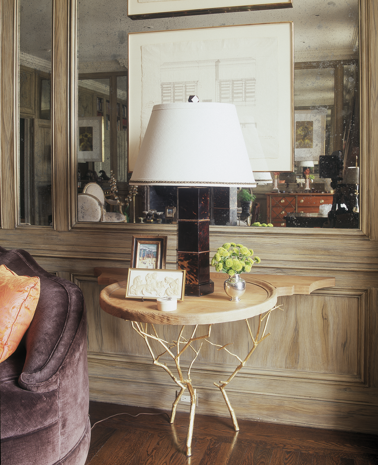 When Anthony Hail, the legendary San Francisco decorator, lived in this apartment in the 1970s, he removed the original paneling above the chair rail in the main entertaining space. In this almost perfectly square living room, we replaced the paneling to restore the space’s original sense of rhythm and commissioned Karin Wikström to paint all the trim, including original plaster reliefs above the doors, with a faux bois finish that evokes bleached walnut. We then incorporated the antiqued mirror into the newly reconstructed boiserie. Both the furniture—including numerous antique French and Russian chairs, which can be easily moved across the bare floors—and the dark, smoky, neutral color scheme were selected to allow flowers, artwork, and accessories to vary its mood depending on the season, event, or even hour.