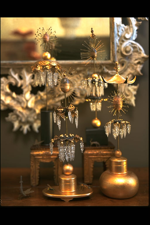 Andrew’s fantasy creations fill the space and live comfortably side-by-side with antiques and objects collected on travels. A focal point of the entertaining space is a fanciful secretary he created; it features a canopy of gesso-covered linen, faux coral fretwork, and oyster shells. Four vintage side chairs continue the fantasy theme with his addition of faux coral lattice backs, more oyster shells, and drapery skirts made rigid with layers of gesso and paint. An overscaled quilt he crafted from used coffee filters—a medium adopted out of necessity in art school but one he often returns to today—hangs above the living room sofa.